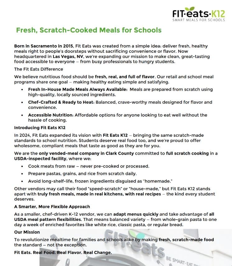 Fit Eats K12 provides fresh, scratch-cooked school meals made with real, high-quality ingredients from a local Las Vegas central kitchen. Unlike “speed-scratch” vendors, we cook meats from raw, prepare grains and pastas daily, and avoid long-shelf-life frozen shortcuts. Our student focused team creates balanced, flavorful meals students actually enjoy, while staying fully compliant with USDA meal patterns. As a flexible, smaller vendor, we adapt menus quickly and use allowable meal pattern flexibilities to offer both whole-grain staples and occasional familiar favorites. Our mission is to make healthy, great-tasting food affordable, accessible, and satisfying for every student, bringing real food and real flavor back to school cafeterias.