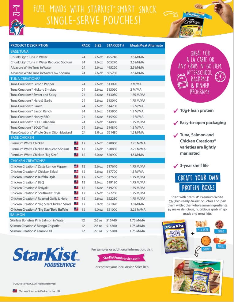 StarKist Co. is a company focused on providing convenient, healthy, shelf-stable food products in the United States. As America’s favorite tuna*, StarKist® represents a tradition of quality, consumer trust and a commitment to sustainability. StarKist® offers healthy and delicious innovative solutions that meet foodservice and grab & go consumer needs. The portfolio of products include Foodservice Labor Saver® no-draining-needed Tuna Pouches, convenient single serve Tuna, Chicken and Salmon Creations® pouches, a line of premium, lightly marinated pouches, and Kits and Lunch-To Go® varieties perfect for grab & go. Visit our website StarKistfoodservice.com for delicious recipes, nutritional information, samples and more!