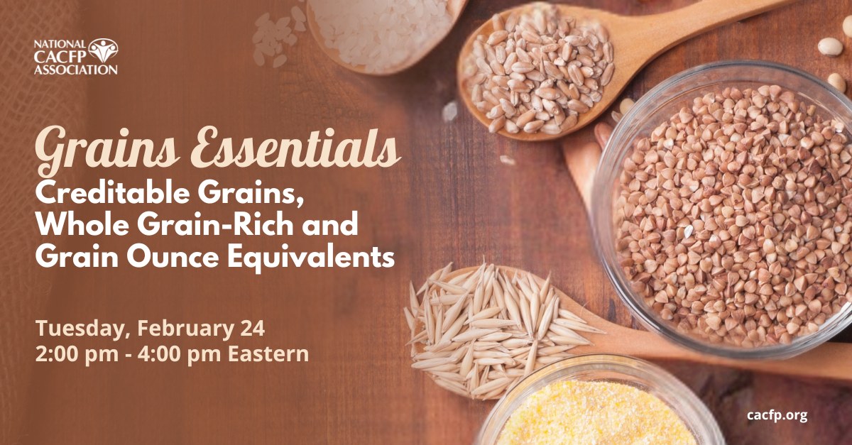 Let's talk about grains! Learn what creditable and non-creditable grains are in the CACFP, how to identify whole grain-rich, and how to calculate grain ounce equivalents in recipes and pre-packaged grain products to meet CACFP grain requirements for the age(s) you are serving.