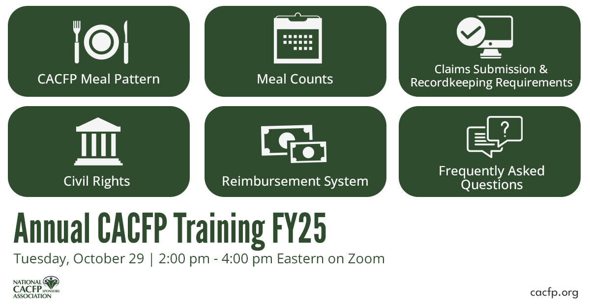 Looking for in-depth CACFP training? Join us for a two-hour training where we will cover essential topics, including meal patterns, meal counts, claims submission, review procedures, recordkeeping requirements, monitoring protocols, the reimbursement system, Civil Rights, key updates in the CACFP, and answers to frequently asked questions using NCA's CACFP Meal Pattern Minutes.