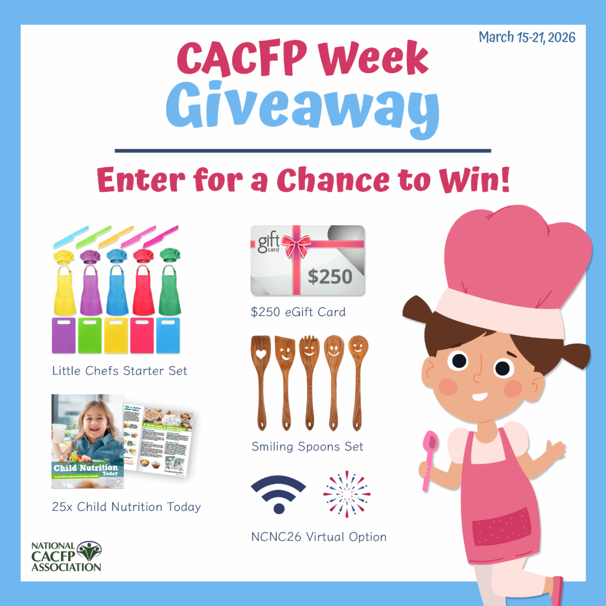 We're giving away fabulous prizes for National CACFP Week, including one grand prize valued at over $600! There are many ways that you can enter to win. Fill out our form to get started and find the links for more entries.