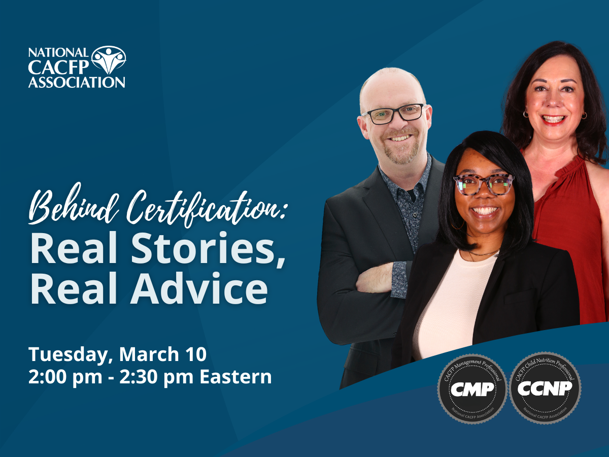 Get ready to be inspired by stories of growth and success. CACFP Professionals are sharing their experience in earning their CACFP Child Nutrition Professional (CCNP) or CACFP Management Professional (CMP) designations in our free webinar next Tuesday, March 10. Take the next step in your career and learn more about the certification program!