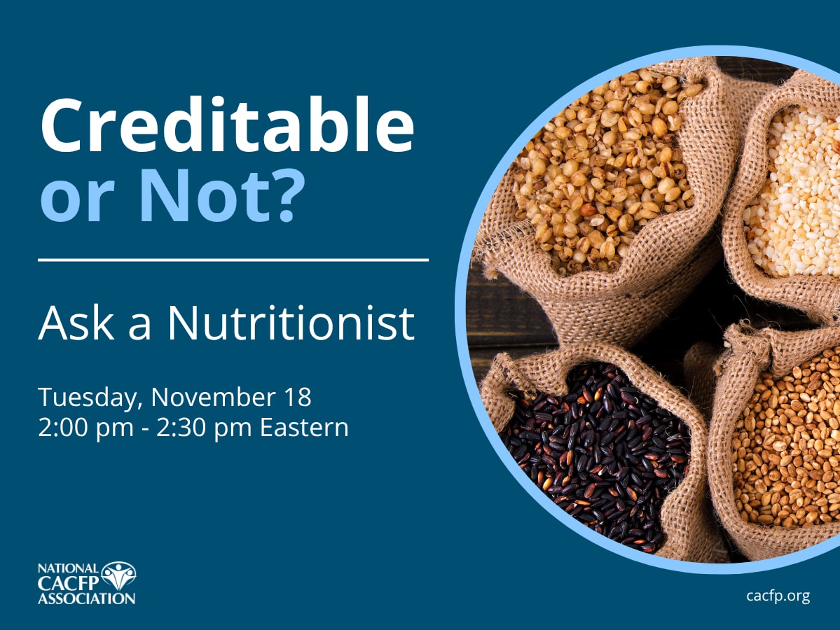 Determining which foods are creditable in the CACFP can sometimes feel like a guessing game. Join our nutrition education specialists for a free Q&A webinar on Tuesday, November 18. Bring your questions about what is and isn't creditable, and learn the reasoning behind each guideline.