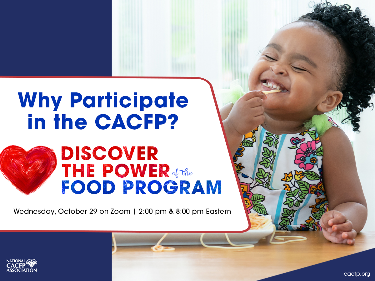 The CACFP provides healthy meals and snacks to over 4.5 million children and adults, and we want to see that number continue to grow! If you know providers who are not on the food program yet, forward this email or share these links! We're hosting a webinar on October 29 so they can learn all about the CACFP and how they can start getting reimbursed for the meals and snacks that they're serving.
