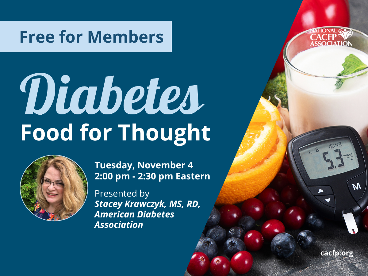 Diabetes impacts millions of children and adults across the country. Learn how to support participants in your care who have diabetes with our webinar on Tuesday, November 4. This event is free for NCA members. Not a member yet? Join today.