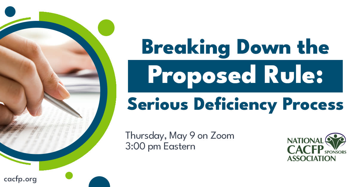 Still have questions about the proposed rule on the serious deficiency process in the CACFP and SFSP? Join the NCA Policy team as we walk through the proposed rule and help stakeholders prepare to make comments.