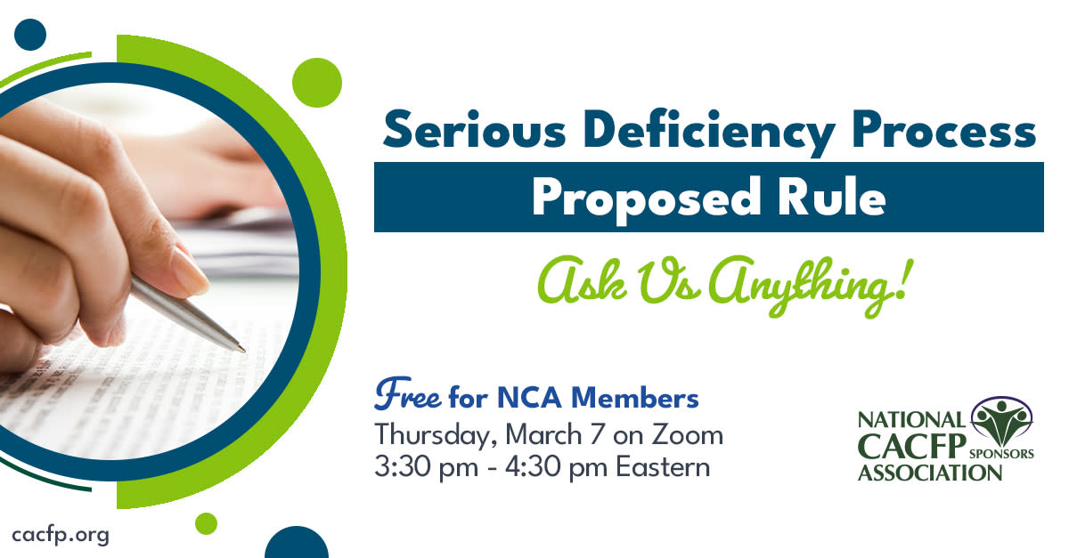 Members of the National CACFP Sponsors Association are invited to join us for an "Ask Us Anything" webinar immediately after the USDA's overview of the proposed rule for the serious deficiency process in the CACFP & SFSP.