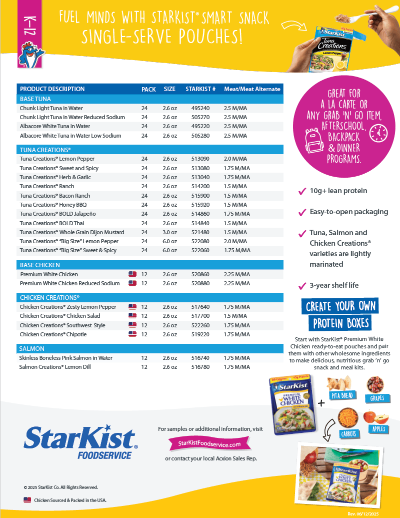 StarKist Co. is a company focused on providing convenient, healthy, shelf-stable food products in the United States. As America’s favorite tuna*, StarKist® represents a tradition of quality, consumer trust and a commitment to sustainability. StarKist® offers healthy and delicious innovative solutions that meet foodservice and grab & go consumer needs. The portfolio of products include Foodservice Labor Saver® no-draining-needed Tuna Pouches, convenient single serve Tuna, Chicken and Salmon Creations® pouches, a line of premium, lightly marinated pouches, and Kits and Lunch-To Go® varieties perfect for grab & go. Visit our website StarKistfoodservice.com for delicious recipes, nutritional information, samples and more! Contact Us: 571-441-8001