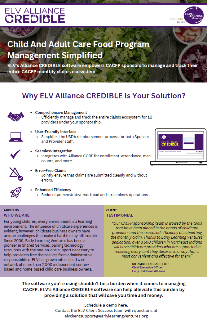 Early Learning Ventures recognizes the majority of childcare providers are small independent businesses that are passionate about caring for children but lack the resources to effectively and efficiently improve the quality of their programs. Therefore, we offer childcare providers, nationwide, much-needed back-office support through our licensing-compliant online childcare management system, Alliance CORE.